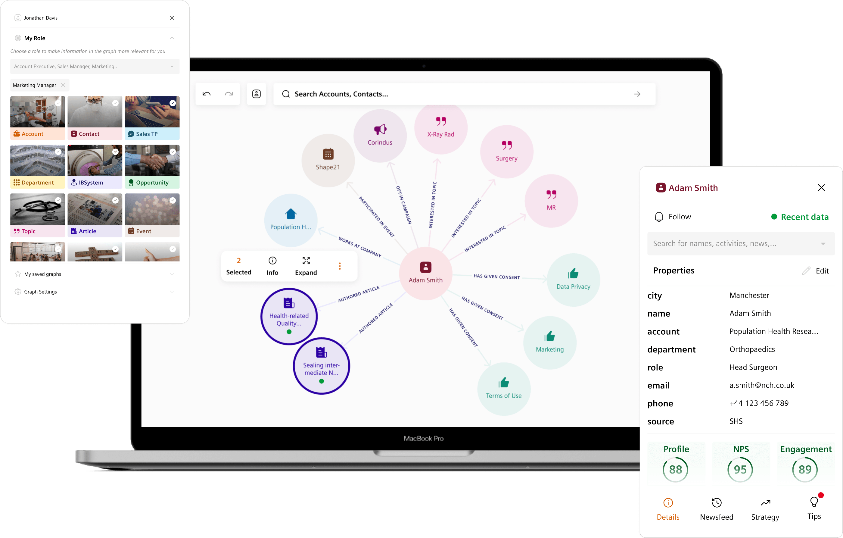 Healthineers has a problem: lots of data in different buckets, with no way to make sense of it. Idea: create an intuitive knowledge graph that allows you to drill down through new interconnected data. Many interviews with Healthineers Sales Reps paved the way for how it might be structured. MVP was crafted and handed over for continued internal development.